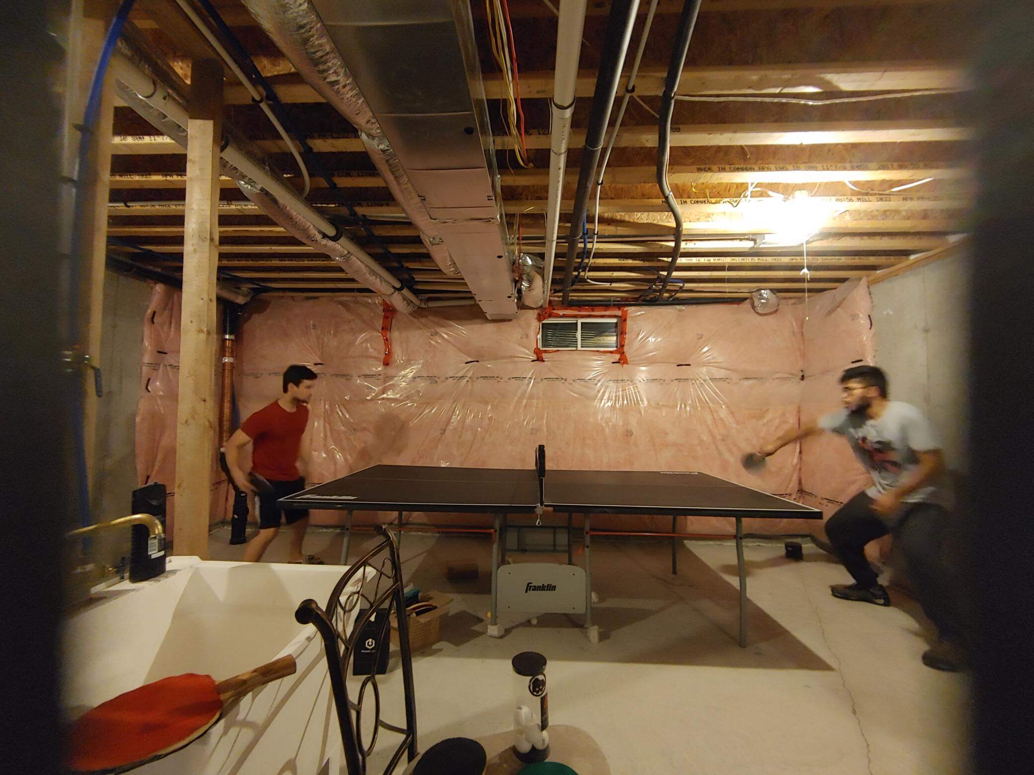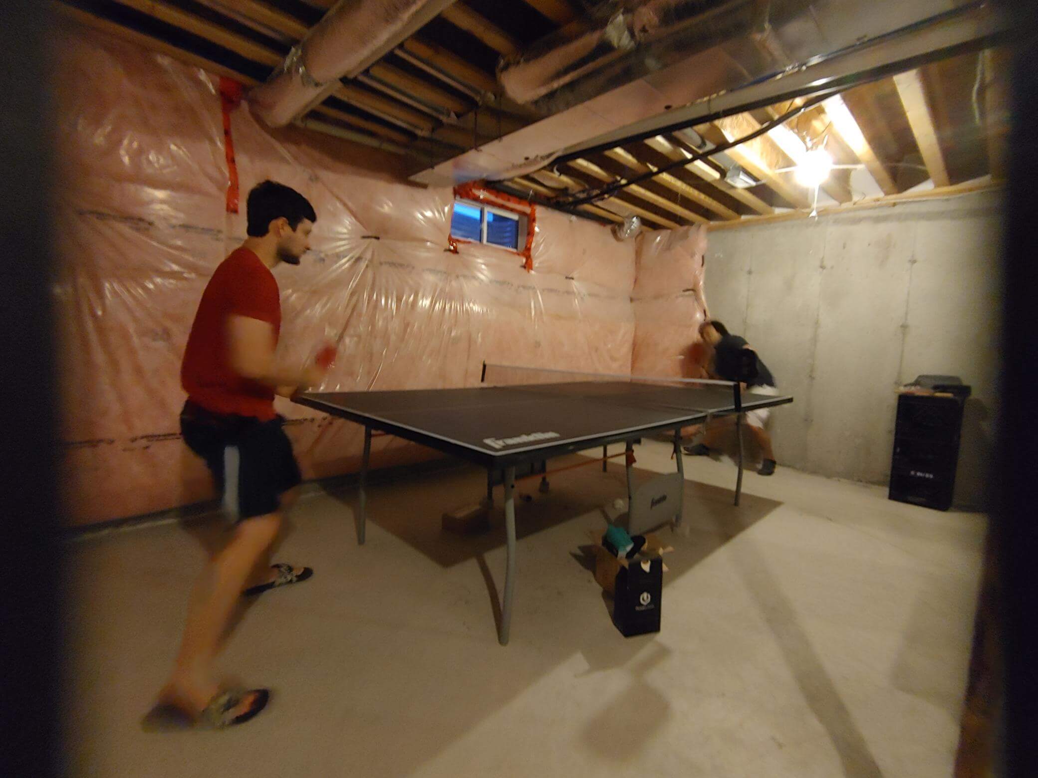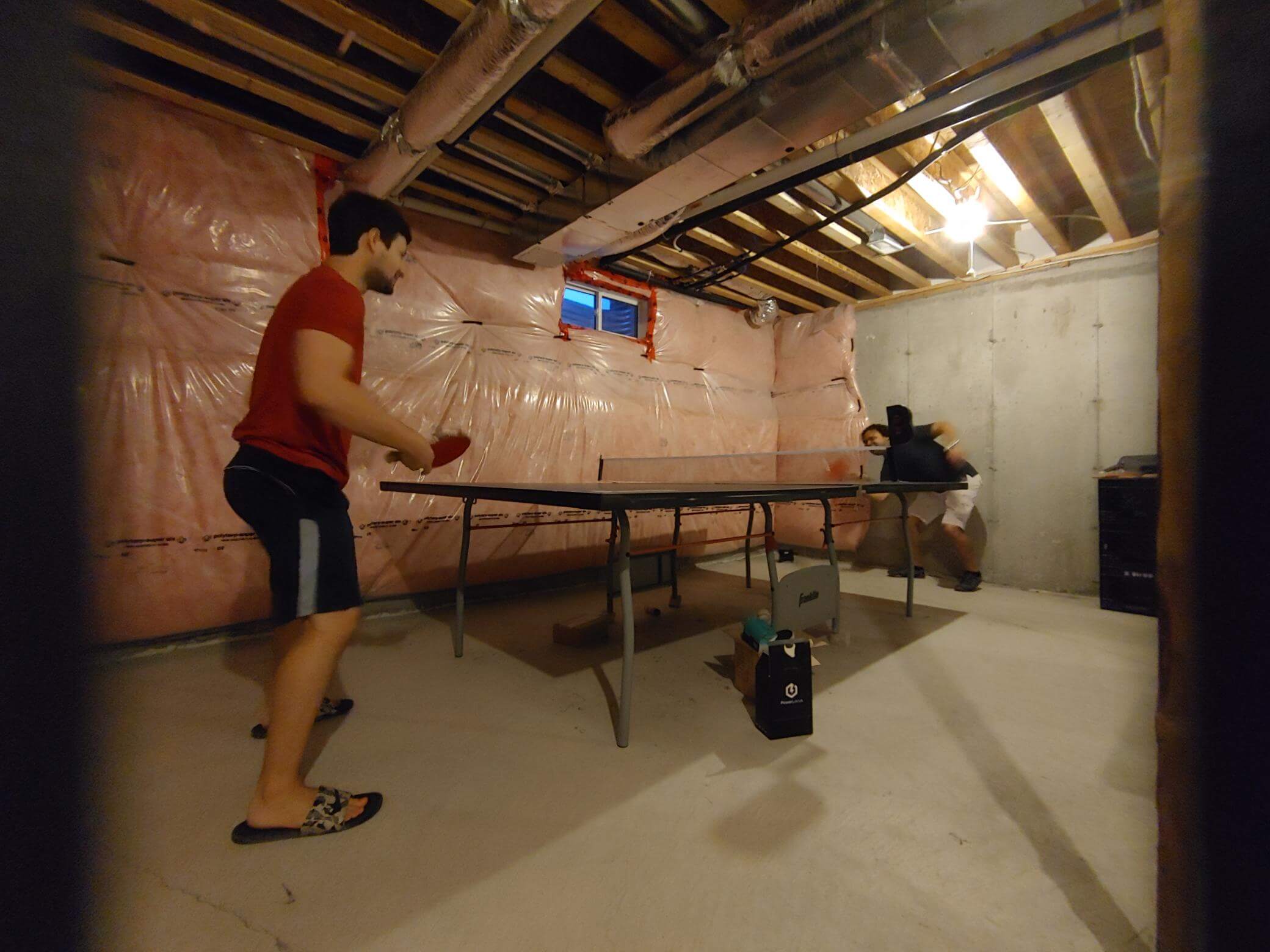 Residential home; ping pong table is in the basement. A ‘cozier’ setup than most, we make it work by playing tight to the table. But make no mistake, the space still allows for next-level smashin’ on a regular basis!