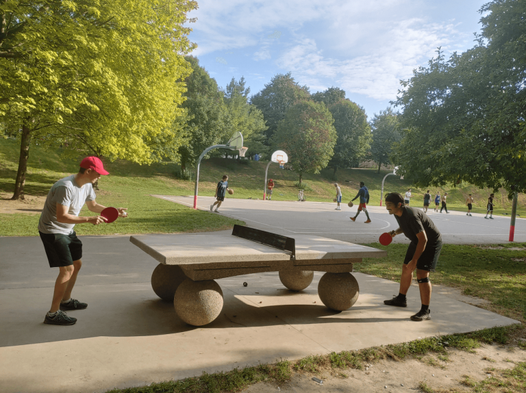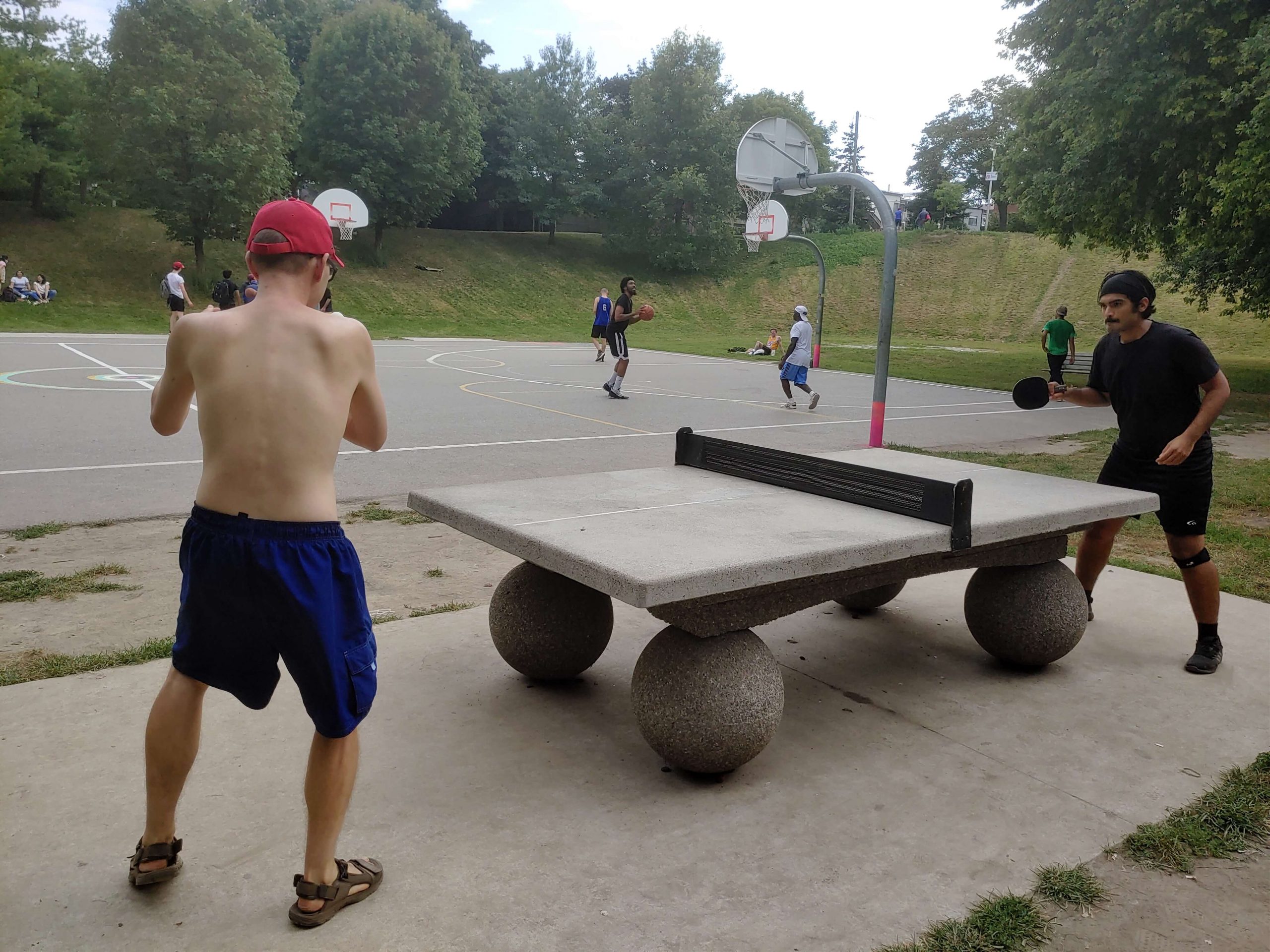 3 concrete tables in total; only 2 nets remaining. Third table may be usable if someone brings their own net. Right next to basketball courts. Metal nets!